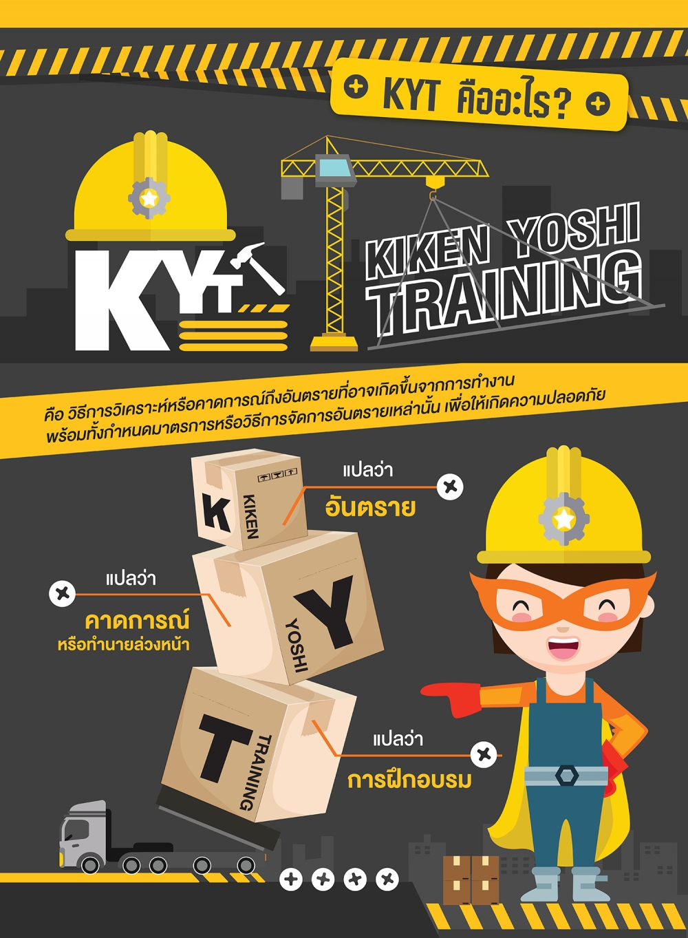 ดังนั้น หลักสูตรนี้ จึงออกแบบมาเพื่อให้เกิดความเข้าใจเรื่อง KYT อย่างถ่องแท้ รวมถึงเหตุและผล กระบวนการนำไปใช้ และการแก้ปัญหา พร้อมการฝึกปฏิบัติ เพื่อให้เกิดความเข้าใจว่าKYT ไม่ใช่เพียงแค่การพูดคุยเรื่องอะไรก็ได้หรือการย้ำแค่เรื่องการสวมใส่ PPE(Personal Protective Equipment) เท่านั้น